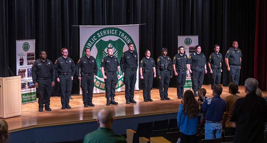 Family, friends and local law enforcement members gathered in Towsley Auditorium to celebrate the 18-member Washtenaw Community College Police Academy’s Class of 2021.